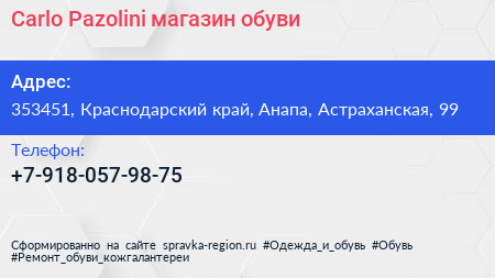 Carlo Pazolini, магазин обуви по адресу 353451, Краснодарский край, Анапа, Астраханская, 99 в дальнейшем Организация, размещена в следующих категориях: