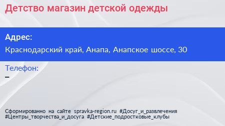 Детство, магазин детской одежды по адресу Краснодарский край, Анапа, Анапское шоссе, 30 в дальнейшем Организация, размещена в следующих категориях: