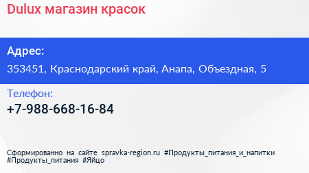 Dulux, магазин красок по адресу 353451, Краснодарский край, Анапа, Объездная, 5 в дальнейшем Организация, размещена в следующих категориях: