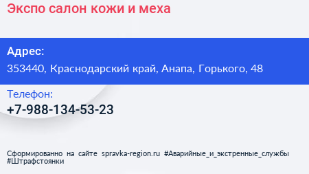 Экспо, салон кожи и меха по адресу 353440, Краснодарский край, Анапа, Горького, 48 в дальнейшем Организация, размещена в следующих категориях: