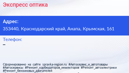 Экспресс-оптика по адресу 353440, Краснодарский край, Анапа, Крымская, 161 в дальнейшем Организация, размещена в следующих категориях: