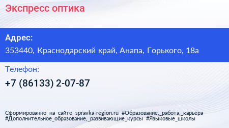 Экспресс-оптика по адресу 353440, Краснодарский край, Анапа, Горького, 18а в дальнейшем Организация, размещена в следующих категориях: