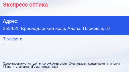 Экспресс-оптика по адресу 353451, Краснодарский край, Анапа, Парковая, 57 в дальнейшем Организация, размещена в следующих категориях: