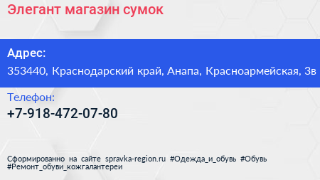 Элегант, магазин сумок по адресу 353440, Краснодарский край, Анапа, Красноармейская, 3в в дальнейшем Организация, размещена в следующих категориях: