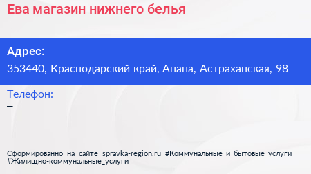 Ева, магазин нижнего белья по адресу 353440, Краснодарский край, Анапа, Астраханская, 98 в дальнейшем Организация, размещена в следующих категориях: