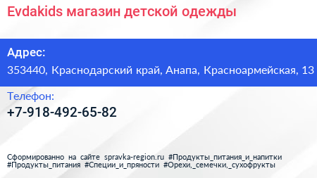 Evdakids, магазин детской одежды по адресу 353440, Краснодарский край, Анапа, Красноармейская, 13 в дальнейшем Организация, размещена в следующих категориях: