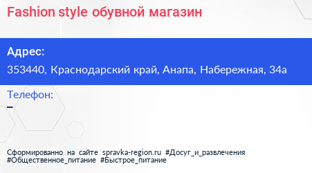 Fashion style, обувной магазин по адресу 353440, Краснодарский край, Анапа, Набережная, 34а в дальнейшем Организация, размещена в следующих категориях: