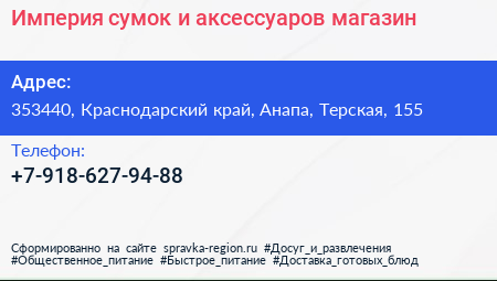 Империя сумок и аксессуаров, магазин по адресу 353440, Краснодарский край, Анапа, Терская, 155 в дальнейшем Организация, размещена в следующих категориях: