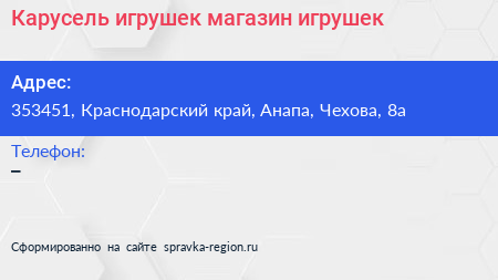 Карусель игрушек, магазин игрушек по адресу 353451, Краснодарский край, Анапа, Чехова, 8а в дальнейшем Организация, размещена в следующих категориях: