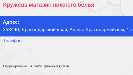 Кружева, магазин нижнего белья по адресу 353440, Краснодарский край, Анапа, Красноармейская, 15 в дальнейшем Организация, размещена в следующих категориях: