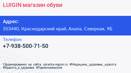 LUIGIN, магазин обуви по адресу 353440, Краснодарский край, Анапа, Северная, 9Б в дальнейшем Организация, размещена в следующих категориях: