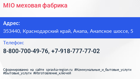 MIO, меховая фабрика по адресу 353440, Краснодарский край, Анапа, Анапское шоссе, 5 в дальнейшем Организация, размещена в следующих категориях: