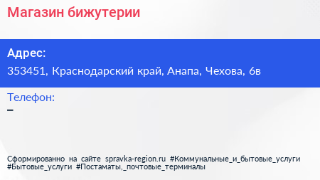 Магазин бижутерии по адресу 353451, Краснодарский край, Анапа, Чехова, 6в в дальнейшем Организация, размещена в следующих категориях: