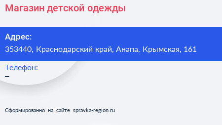Магазин детской одежды по адресу 353440, Краснодарский край, Анапа, Крымская, 161 в дальнейшем Организация, размещена в следующих категориях: