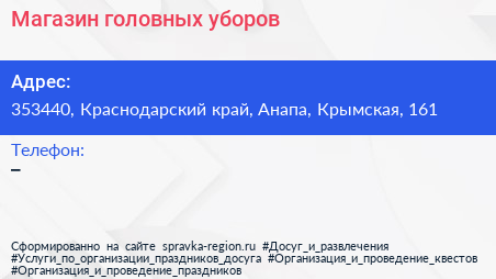 Магазин головных уборов по адресу 353440, Краснодарский край, Анапа, Крымская, 161 в дальнейшем Организация, размещена в следующих категориях:
