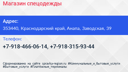 Магазин спецодежды по адресу 353440, Краснодарский край, Анапа, Заводская, 39 в дальнейшем Организация, размещена в следующих категориях:
