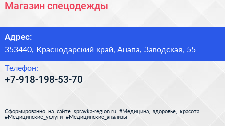 Магазин спецодежды по адресу 353440, Краснодарский край, Анапа, Заводская, 55 в дальнейшем Организация, размещена в следующих категориях: