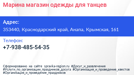Марина, магазин одежды для танцев по адресу 353440, Краснодарский край, Анапа, Крымская, 161 в дальнейшем Организация, размещена в следующих категориях: