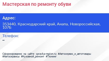 Мастерская по ремонту обуви по адресу 353440, Краснодарский край, Анапа, Новороссийская, 107Б в дальнейшем Организация, размещена в следующих категориях: