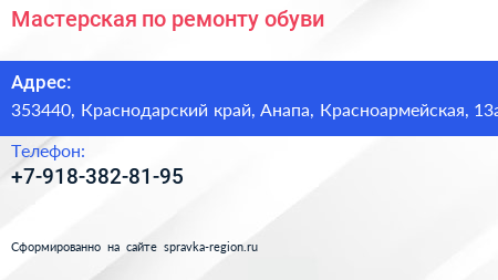 Мастерская по ремонту обуви по адресу 353440, Краснодарский край, Анапа, Красноармейская, 13а в дальнейшем Организация, размещена в следующих категориях: