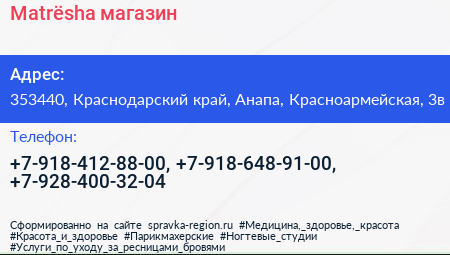 Matrёsha, магазин по адресу 353440, Краснодарский край, Анапа, Красноармейская, 3в в дальнейшем Организация, размещена в следующих категориях: