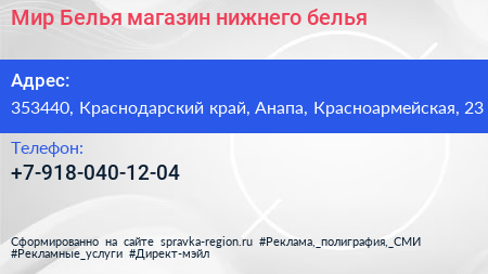 Мир Белья, магазин нижнего белья по адресу 353440, Краснодарский край, Анапа, Красноармейская, 23 в дальнейшем Организация, размещена в следующих категориях: