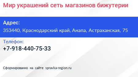 Мир украшений, сеть магазинов бижутерии по адресу 353440, Краснодарский край, Анапа, Астраханская, 75 в дальнейшем Организация, размещена в следующих категориях: