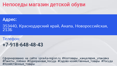 Непоседы, магазин детской обуви по адресу 353440, Краснодарский край, Анапа, Новороссийская, 213Б в дальнейшем Организация, размещена в следующих категориях: