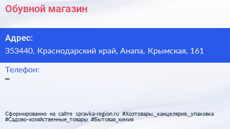 Обувной магазин по адресу 353440, Краснодарский край, Анапа, Крымская, 161 в дальнейшем Организация, размещена в следующих категориях: