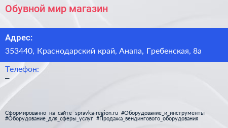 Обувной мир, магазин по адресу 353440, Краснодарский край, Анапа, Гребенская, 8а в дальнейшем Организация, размещена в следующих категориях: