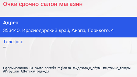 Очки срочно, салон-магазин по адресу 353440, Краснодарский край, Анапа, Горького, 4 в дальнейшем Организация, размещена в следующих категориях: