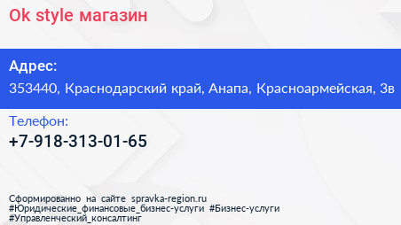 Ok style, магазин по адресу 353440, Краснодарский край, Анапа, Красноармейская, 3в в дальнейшем Организация, размещена в следующих категориях: