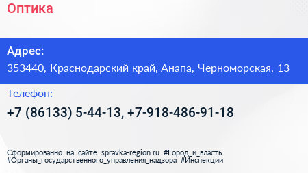Оптика по адресу 353440, Краснодарский край, Анапа, Черноморская, 13 в дальнейшем Организация, размещена в следующих категориях: