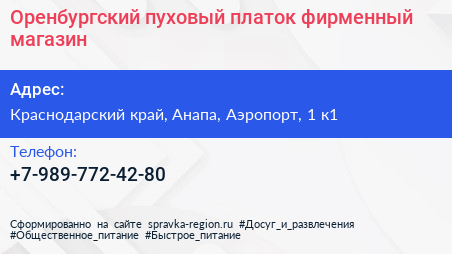 Оренбургский пуховый платок, фирменный магазин по адресу Краснодарский край, Анапа, Аэропорт, 1 к1 в дальнейшем Организация, размещена в следующих категориях: