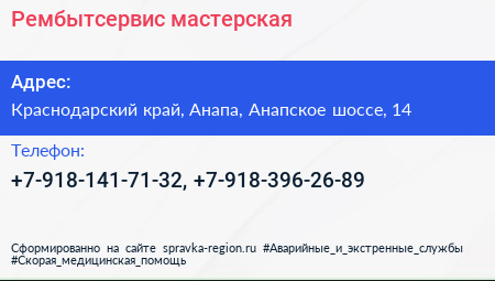 Рембытсервис, мастерская по адресу Краснодарский край, Анапа, Анапское шоссе, 14 в дальнейшем Организация, размещена в следующих категориях: