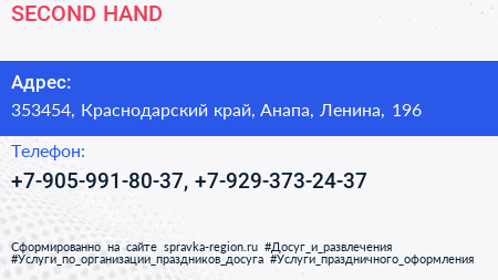 SECOND HAND по адресу 353454, Краснодарский край, Анапа, Ленина, 196 в дальнейшем Организация, размещена в следующих категориях: