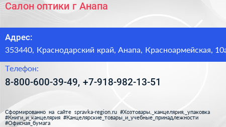 Салон оптики, г. Анапа по адресу 353440, Краснодарский край, Анапа, Красноармейская, 10а в дальнейшем Организация, размещена в следующих категориях: