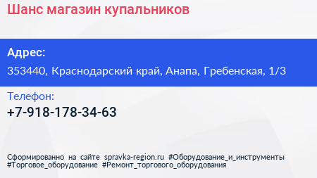 Шанс, магазин купальников по адресу 353440, Краснодарский край, Анапа, Гребенская, 1/3 в дальнейшем Организация, размещена в следующих категориях: