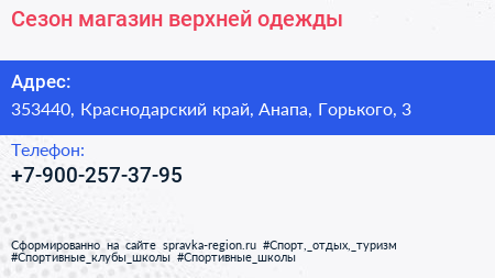Сезон, магазин верхней одежды по адресу 353440, Краснодарский край, Анапа, Горького, 3 в дальнейшем Организация, размещена в следующих категориях: