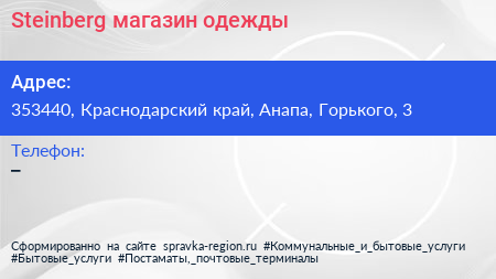 Steinberg, магазин одежды по адресу 353440, Краснодарский край, Анапа, Горького, 3 в дальнейшем Организация, размещена в следующих категориях: