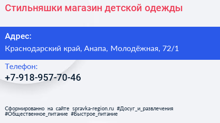 Стильняшки, магазин детской одежды по адресу Краснодарский край, Анапа, Молодёжная, 72/1 в дальнейшем Организация, размещена в следующих категориях:
