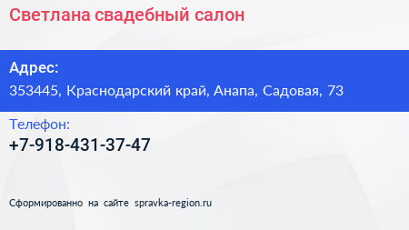 Светлана, свадебный салон по адресу 353445, Краснодарский край, Анапа, Садовая, 73 в дальнейшем Организация, размещена в следующих категориях: