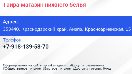 Таира, магазин нижнего белья по адресу 353440, Краснодарский край, Анапа, Красноармейская, 15 в дальнейшем Организация, размещена в следующих категориях: