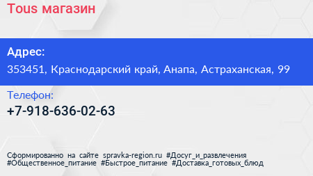 Tous, магазин по адресу 353451, Краснодарский край, Анапа, Астраханская, 99 в дальнейшем Организация, размещена в следующих категориях:
