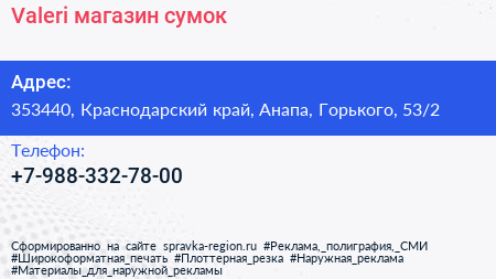 Valeri, магазин сумок по адресу 353440, Краснодарский край, Анапа, Горького, 53/2 в дальнейшем Организация, размещена в следующих категориях: