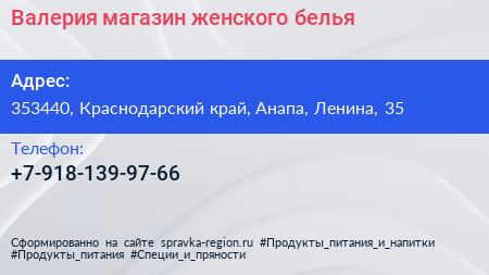 Валерия, магазин женского белья по адресу 353440, Краснодарский край, Анапа, Ленина, 35 в дальнейшем Организация, размещена в следующих категориях: