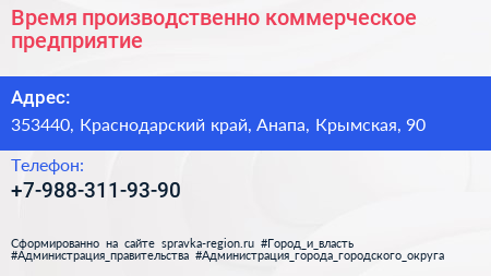 Время, производственно-коммерческое предприятие по адресу 353440, Краснодарский край, Анапа, Крымская, 90 в дальнейшем Организация, размещена в следующих категориях: