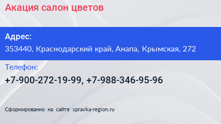 Акация, салон цветов по адресу 353440, Краснодарский край, Анапа, Крымская, 272 в дальнейшем Организация, размещена в следующих категориях:
