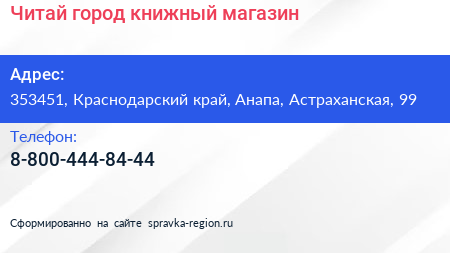 Читай город, книжный магазин по адресу 353451, Краснодарский край, Анапа, Астраханская, 99 в дальнейшем Организация, размещена в следующих категориях: