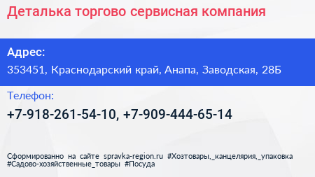 Деталька, торгово-сервисная компания по адресу 353451, Краснодарский край, Анапа, Заводская, 28Б в дальнейшем Организация, размещена в следующих категориях: